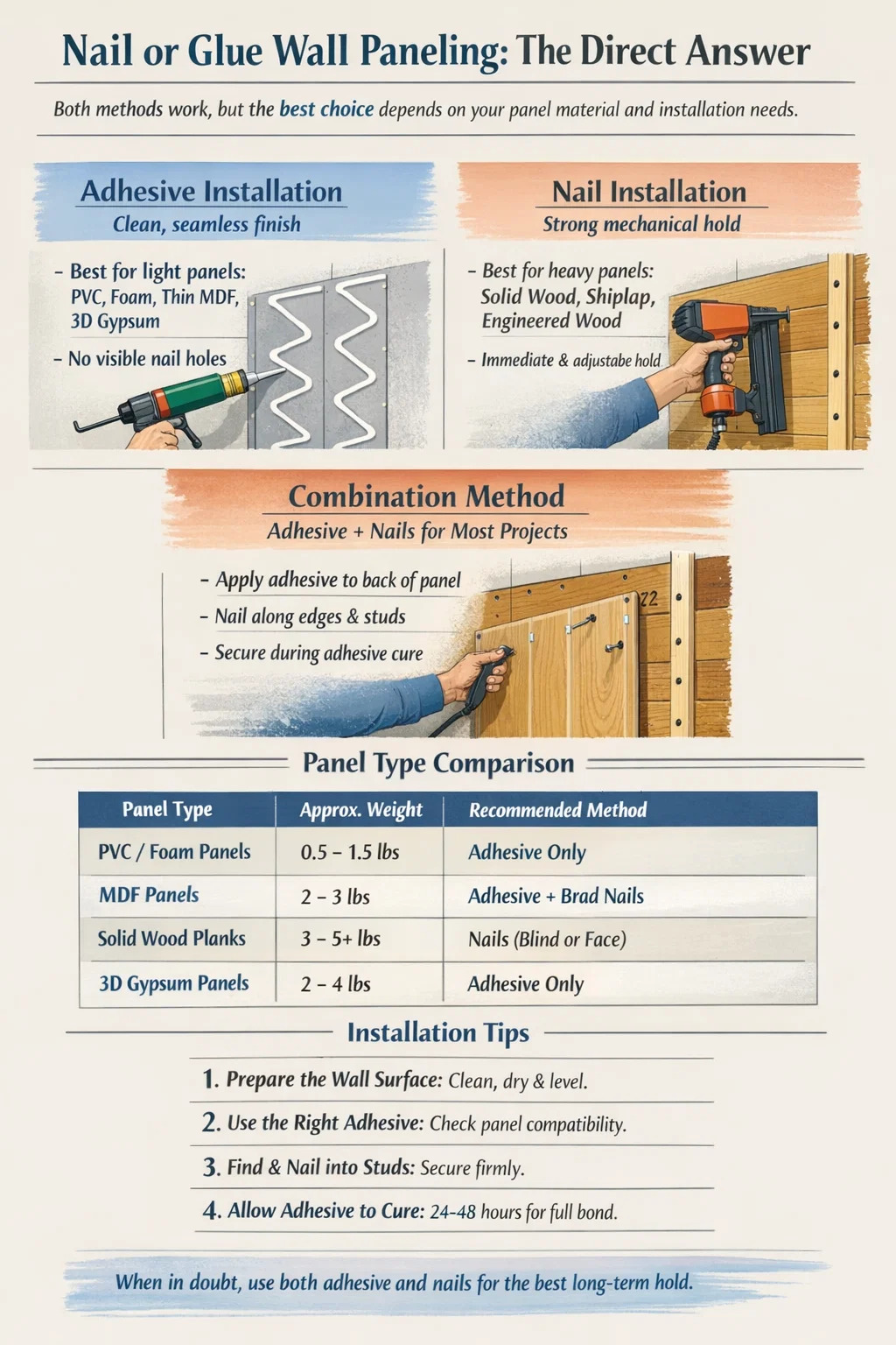 If you are using MDF decorative panels, engineered wood panels, or any heavy panel material on standard drywall, do not skip the combination method. The small extra effort of driving brad nails while the adhesive cures will produce a result that stays flat, stays bonded, and stays looking professional for many years. The adhesive does the structural work; the nails keep everything exactly where you put it while the adhesive reaches full strength.