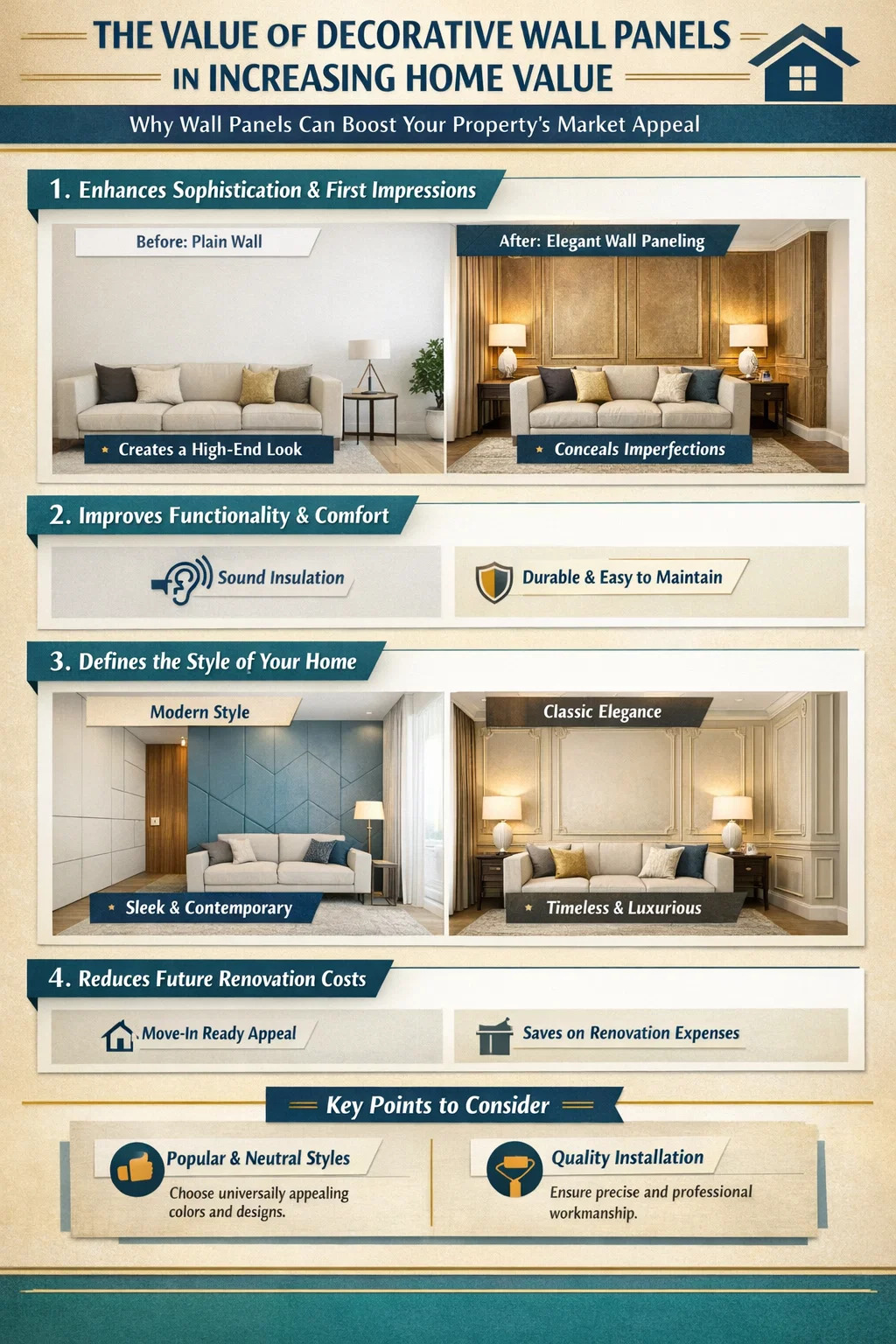 Visual Center: A well-designed decorative wall panel can instantly give an otherwise ordinary room a "designer's" feel. Compared to simple painting, the texture and three-dimensionality of the panel will make potential buyers perceive the house as more tasteful and willing to pay a premium.