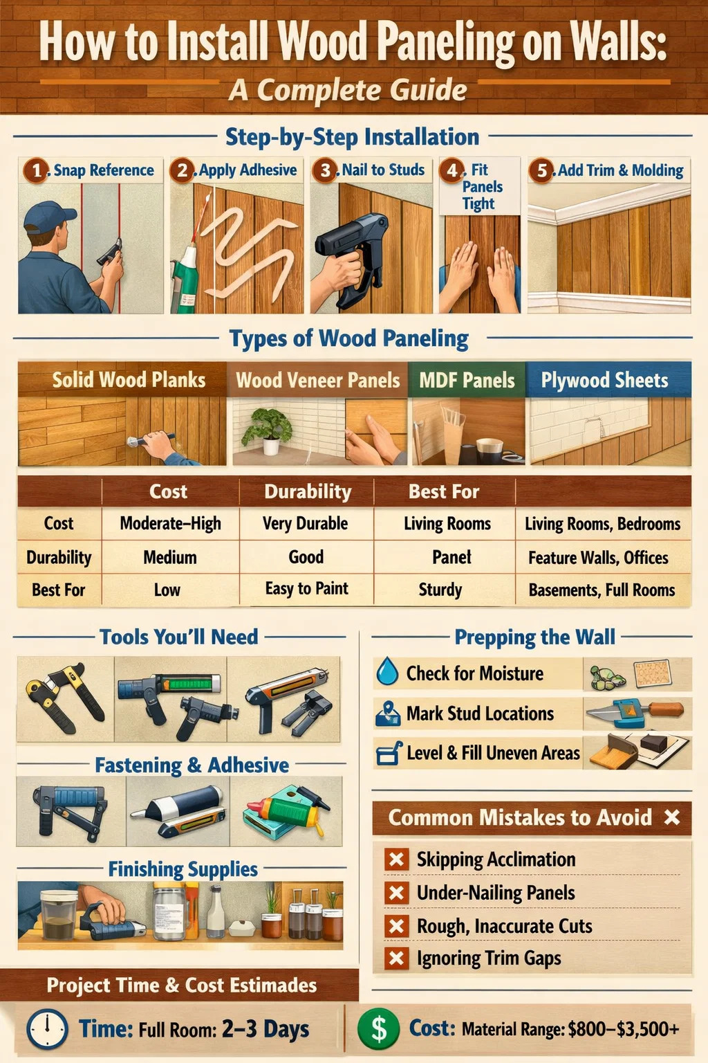 The sections below break down each stage in full detail, covering everything from wall prep and stud location to corner cuts, adhesive selection, and how to handle tricky spots like outlets and windows. If you've never worked with wall paneling before, this guide is designed to get you through the entire project without expensive mistakes.