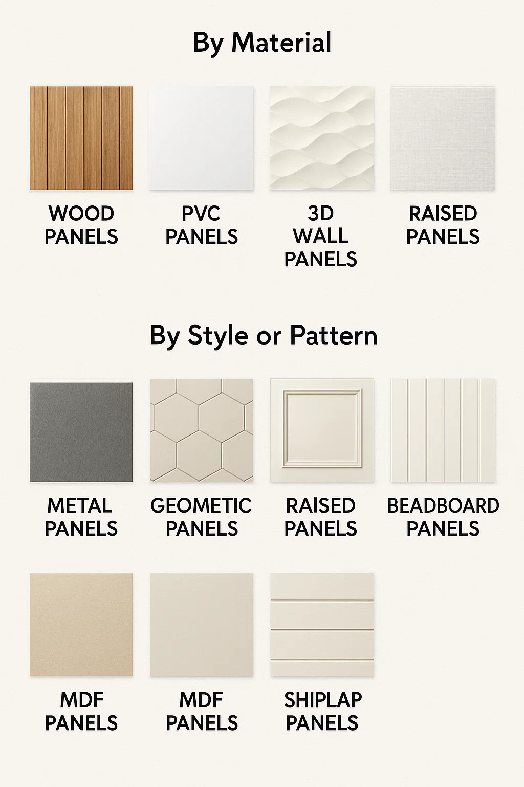 --Wood Panels/Wood Wall Panels: This covers a wide range, from classic raised panels to modern shiplap or board-and-batten looks. The wood can be real or a very convincing laminate.