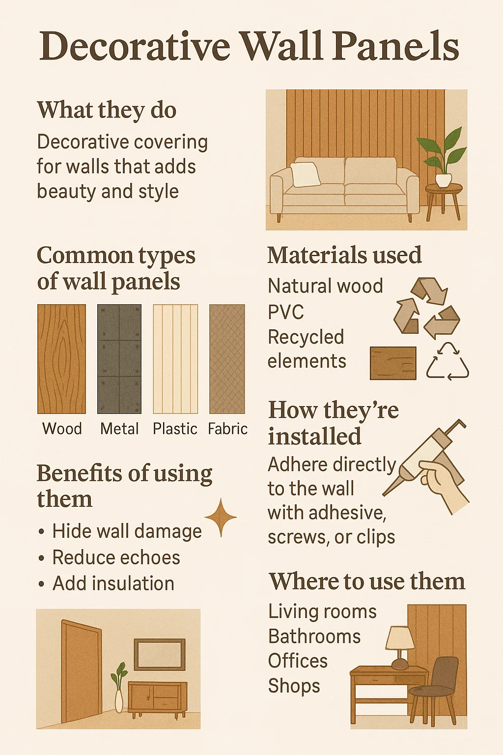 These panels act as a decorative covering for walls, adding beauty and style to any space. They can transform plain walls into eye-catching features, helping to create a cozy or modern atmosphere in places like living rooms or hallways. People often use them to cover up flaws like cracks or stains, making walls look fresh and attractive.