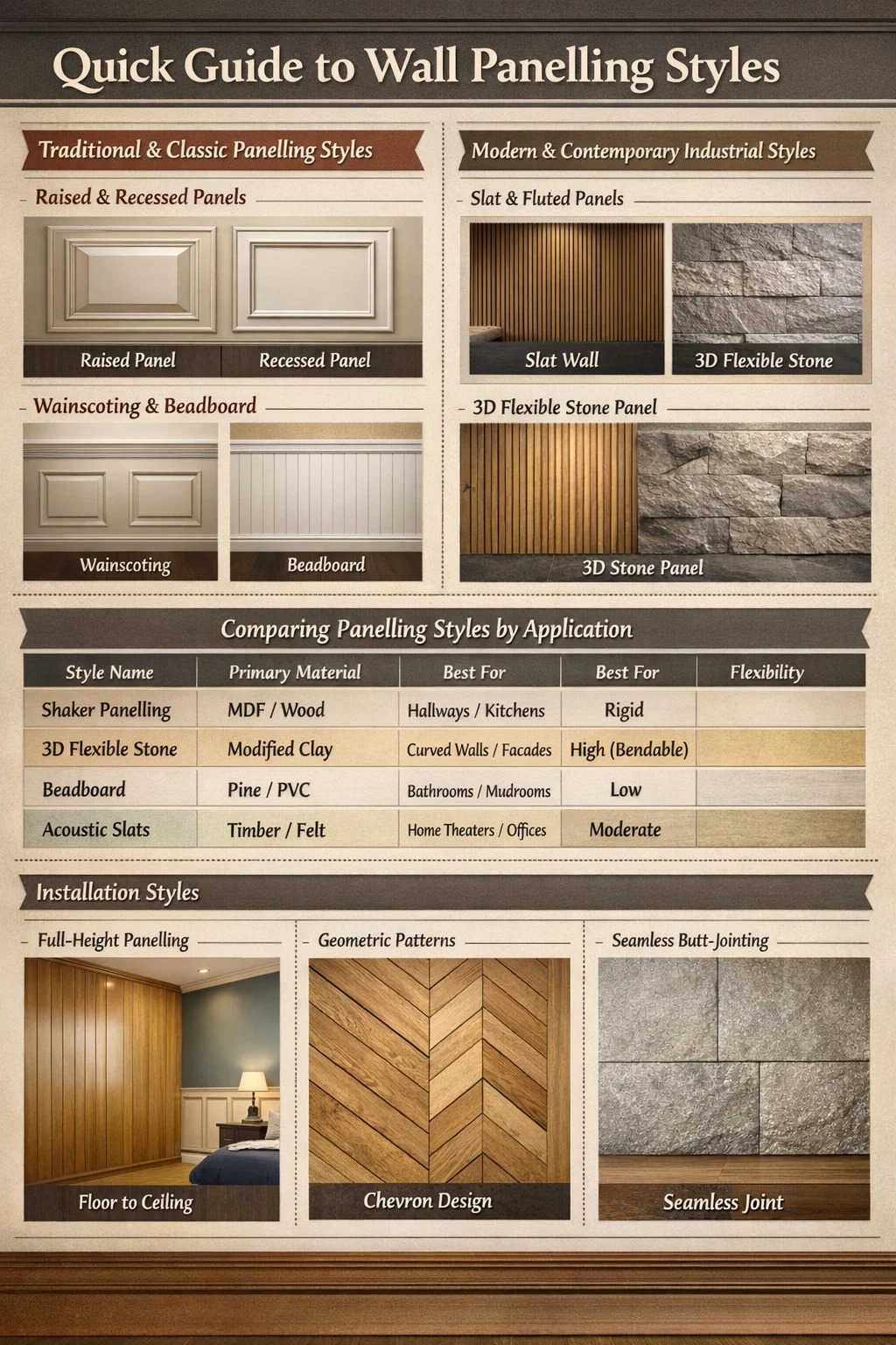 The world of interior design offers a diverse array of wall treatments ranging from traditional Raised Panels and Wainscoting to modern, high-tech solutions like the 3D Flexible Stone Wall Panel. To select the right style, you must balance the architectural era of your property with the desired tactile texture and maintenance requirements of the material.